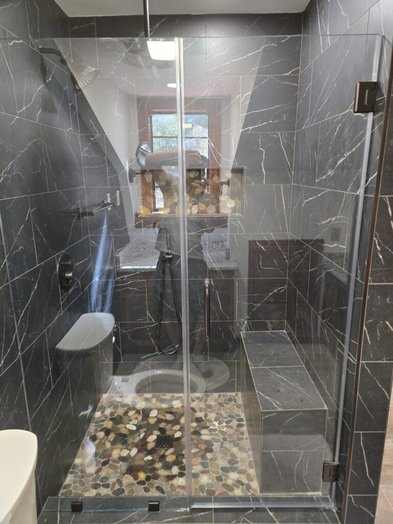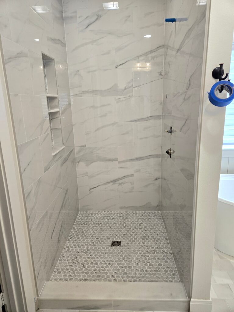 Tile is installed with careful layout planning, consistent spacing, and clean transitions. Shower systems are built with proper slope, waterproofing, and drainage. Niches and benches are framed as part of the structure, not surface add-ons. Grouting and silicone are applied correctly to allow for movement and prevent cracking. Shower door glass is installed as the final step to ensure a proper fit against finished tile surfaces. A final walkthrough is completed before final payment is collected, and the project is only considered complete once the homeowner approves the work.